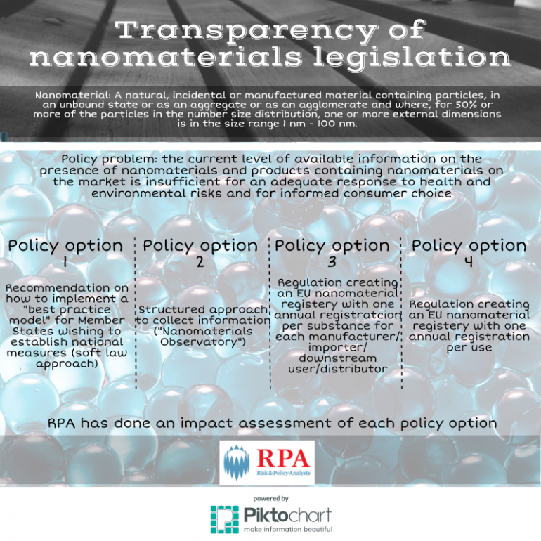 The EC's Directorate General for Enterprise and Industry has commissioned RPA and BiPRO GmbH to undertake a study to support the Commission on the preparation of an impact assessment to identify and develop the most adequate way to increase transparency and ensure regulatory oversight for nanomaterials.