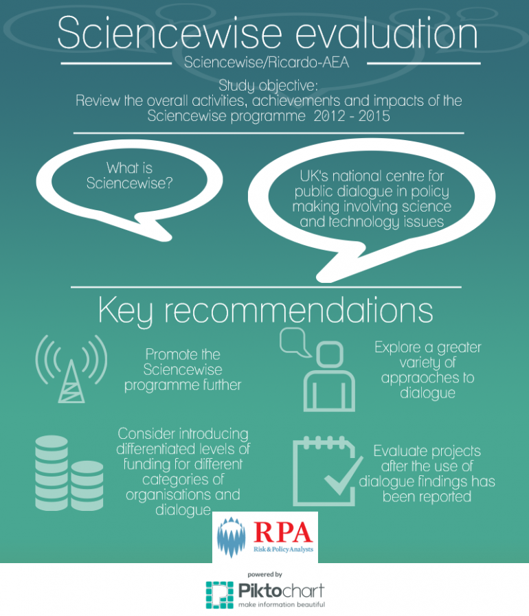 RPA has recently completed an independent evaluation of the Sciencewise programme for 2012-2015 on behalf of Ricardo-AEA. The Sciencewise programme is funded by Business, Innovation and Skill (BIS) and run in partnership with Ricardo-AEA, Involve and the British Science Association.